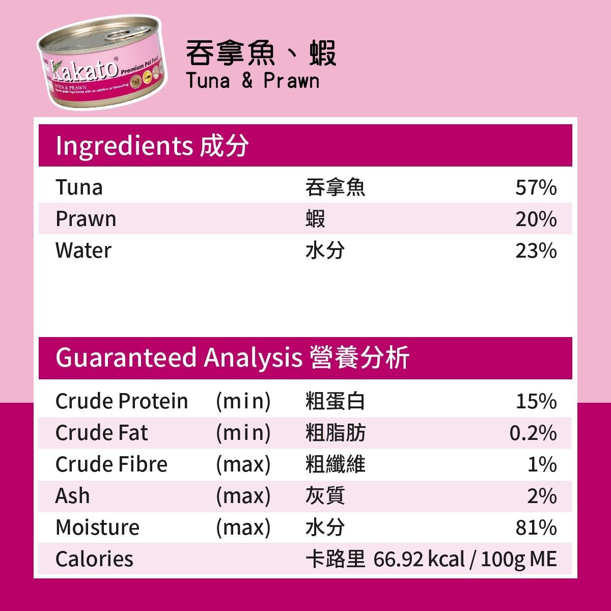 tuna吞拿魚 (57%),Shrimp蝦 (20%),brown rice糙米 (3%),water水 (20%)